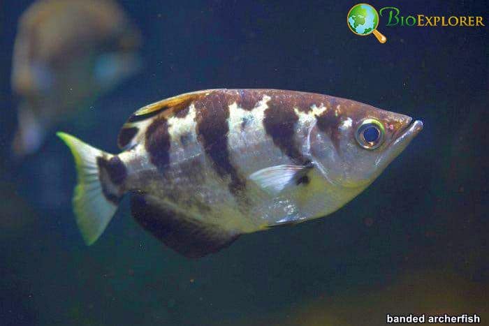 The banded archerfish is a small silver-colored fish with distinct black bands. It lives in brackish water in the Indo-Pacific region, mainly in mangrove forests and river mouths.