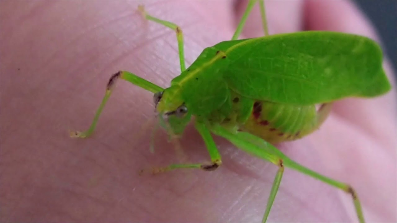 - This katydid’s ears are located on the legs, right below its knee-like joints.
