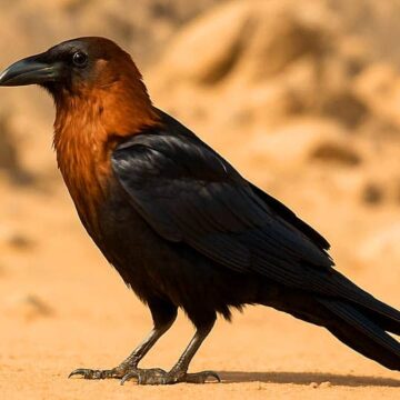 The brown-necked raven (Corvus ruficollis) is a distinctive member of the Corvidae family, notable for its adaptability to some of the harshest environments on Earth. This species is primarily distributed across North Africa, the Middle East, and parts of southwestern Asia, where it thrives in arid and semi-arid landscapes.