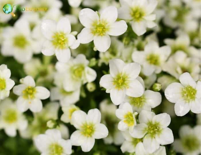 The Saxifragaceae flowers[4] are bisexual and radially symmetrical (actinomorphicWhat is actinomorphic?A characteristic of the flower exhibiting radial symmetry such as starfish or Daisy flower; capable of being bisected into identical halves along more than one axis, forming mirror images. Opposite is Zygomorphic.) in branched inflorescences or solitary. Their flowers are either greenish, white, or yellow. Other species are pink, red, or purple. There are 5 sepals.