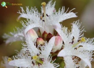 Buckbean (Menyanthes trifoliate), commonly known as marsh trefoil or bogbean, is an emergent rhizomatous perennial that generally grows in shallow water at the edge of lakes/ponds in swamps. The 5-petaled star-shaped hairy whitish flowers bloom in terminal clusters on stems up to 12 inches tall in May and June.