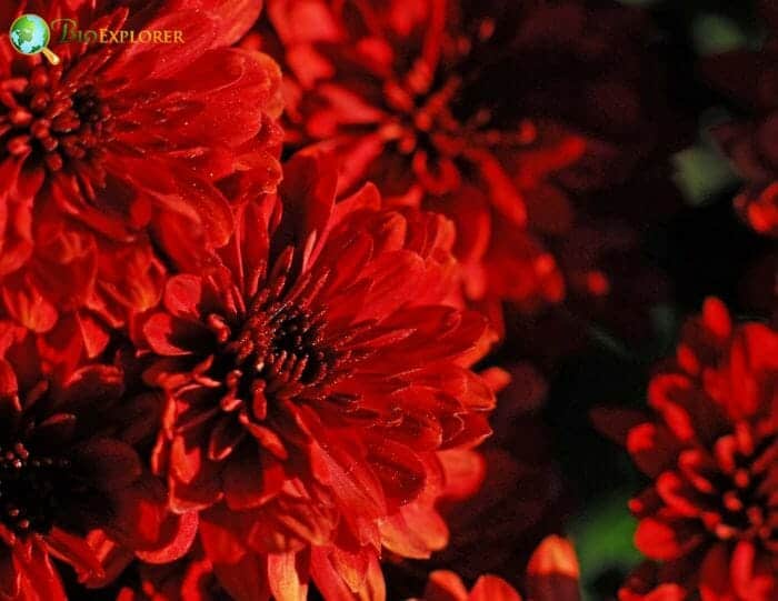 Colors range from red to yellow, brown to pink, and the flowering period runs from mid-summer to fall. There are 40 species and thousands of cultivars[1] of chrysanthemums. Seasonal Chrysanthemums like the Red Rover are usually only available during the fall months. Chrysanthemums can appear as a single stem with many branching flowers or a single large flower head that sits atop the stem.