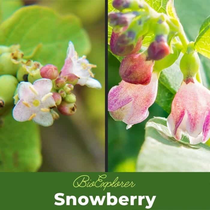 Snowberry leaves are 1.5 to 5 cm (0.59 to 1.97 inches) long, rounded, with entire margins, or 1 or 2 lobes at the underside. The flowers are small, pink to greenish –white, in most species in small clusters of 5 to 15 together, in some individually or in pairs (e.g., Symphoricarpos microphyllus).